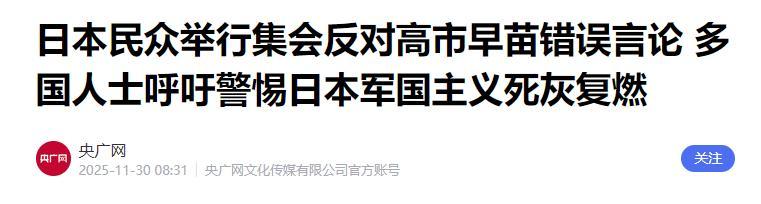 接下来,高市早苗大概率不会停止她的错误做法,而她已经在日本国内点燃了民众的愤怒。在11月29日,日本民众再次举行抗议集会,高呼“高市早苗下台”。这是高市发表涉台错误言论以来,日本民众进行的第四轮抗议活动,而且范围已经从东京都扩散到多个县市。民众的愤怒、经济界的出面,再加上曝出的丑闻,这些因素交织在一起,使得高市早苗内阁面临严重的执政合法性危机。如果高市还看不清现状,继续进行“末路狂奔”,那么不仅中日关系会被冰封,她的政治生命也会被冻结!