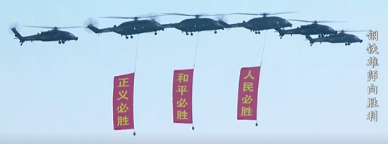 2025日上午,北京天安门广场,6架直-10武装直升机护卫着党旗、国旗、军旗,3架直-8L运输直升机悬挂着“正义必胜”“和平必胜”“人民必胜”的条幅,以“米秒不差”的精准编队飞过天安门上空。